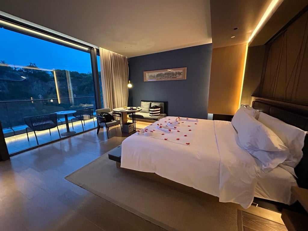 All of the rooms overlook the rock face of the quarry which turns into a massive projection screen each night as they put on an animated light show that involves over 30 projectors and 18 lasers and 80 speakers. Guests can enjoy the show from the comfort of their rooms, like having your own private theatre box.
